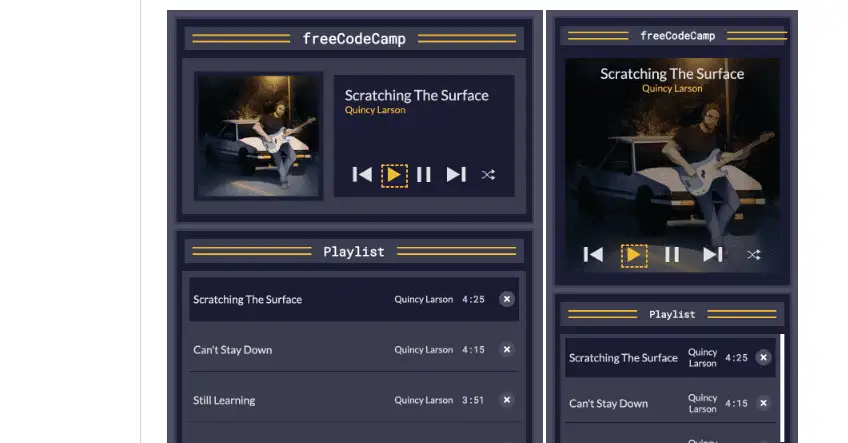 - <div class=”player-bar”>: Displays a header with the title and parallel lines for styling.